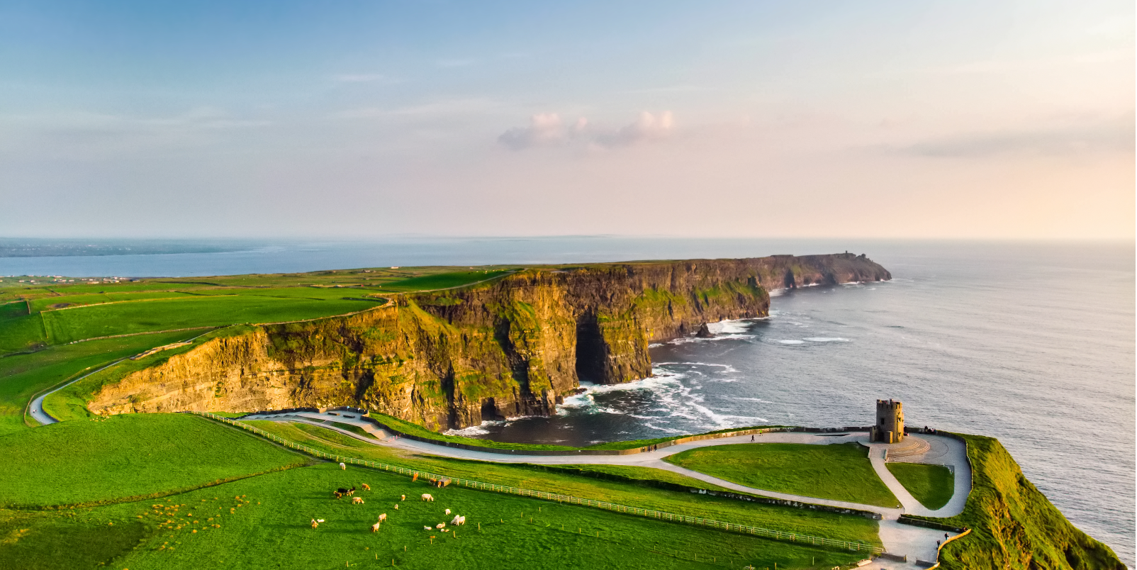 Le matin, découverte des majestueuses falaises de Moher, un site naturel impressionnant qui s'élève à plus de 200 mètres au-dessus de l'océan Atlantique. L'après-midi, visite du château médiéval de Bunratty et son Folk Park, reconstitution vivante d'un village du XIXe siècle.